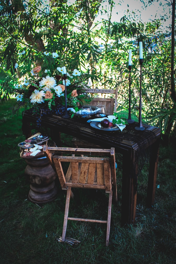 There is something about Halloween that is refreshing to me as a stylist. Working with bold colors to create moody vibes is exciting after styling for the spring and summer months. My sister (The Farmhouse Story) and I share the same excitement for this time of year. So we decided to collaborate to create this little scene for two among some trees that hadn’t quite changed color yet. This season pushes us both out of our decorative comfort zones. We gravitate towards neutral and natural tones, but to honor October, we chose to use gorgeous pops of black and deep purple to accent this table. I also wanted to give you guys a simple “recipe” in this post as well, so I put together a Halloween charcuterie board with colors and flavors to accompany these October vibes.